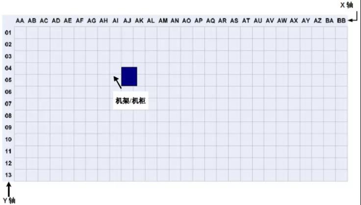 在數據中心,機柜和機架的位置和布局可以根據活動地板的劃分進行組織和標記。根據ANSI/TIA/EIA-606-A標準,數據室應使用兩個或兩個字母,每個600mm*600mm活動地板用阿拉伯數字標識。在數據中心機房平面圖上建立X、Y坐標系的網格,用字母標記X軸,用數字標記Y軸,建立坐標原點。機架和機柜的位置基于它們在網格地圖上的正面坐標。標注如下圖 2所示