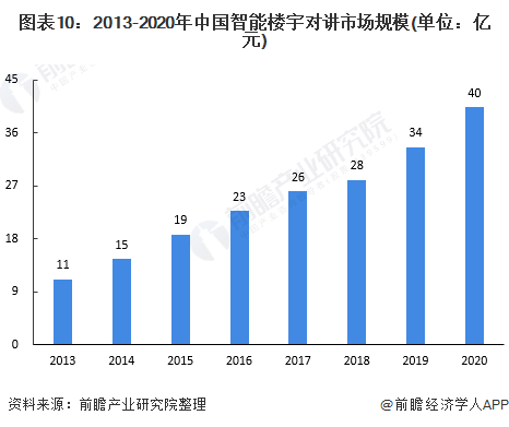 近年來,隨著居民生活水平的提高,居民住宅小區的管理越來越規范和嚴謹,居民對于樓宇對講系統的性能要求有所提升,不再局限于簡單的語音對講,而逐年向網絡化、可視化化發展。數據顯示,隨著樓宇對講系統的不斷升級,樓宇對講智能化滲透率不斷提高,目前滲透率在20%左右。2019年中國樓宇對講系統市場規模為154億元,由此得出2019年中國智能樓宇對講市場規模約為34億元,2013-2019年復合增長率為20%。據估算,2020年市場規模約為40億元左右。